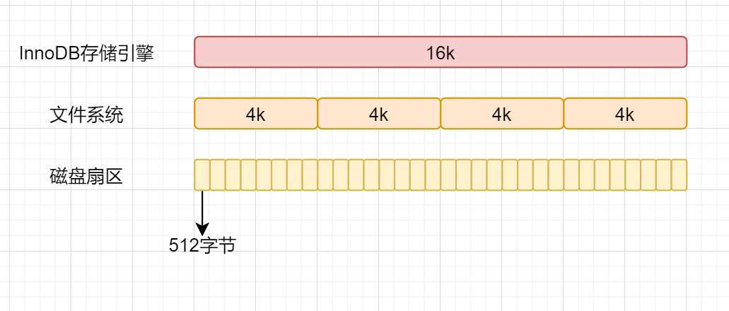 在计算机中,磁盘存储数据最小单元是扇区,一个扇区的大小是512字节。 文件系统中,最小单位是块,一个块大小就是4k; InnoDB存储引擎最小储存单元是页,一页大小就是16k。