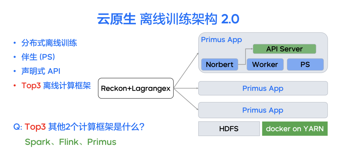离线训练框架 1.0 于 2019 年进行了系统级重构,新一代离线训练框架 2.0 增加了“多角色弹性调度”“多角色 Failover 能力”“训练进度增量 Checkpoint ”等功能,提供“灵活”“高效”“易用”的模型训练能力。