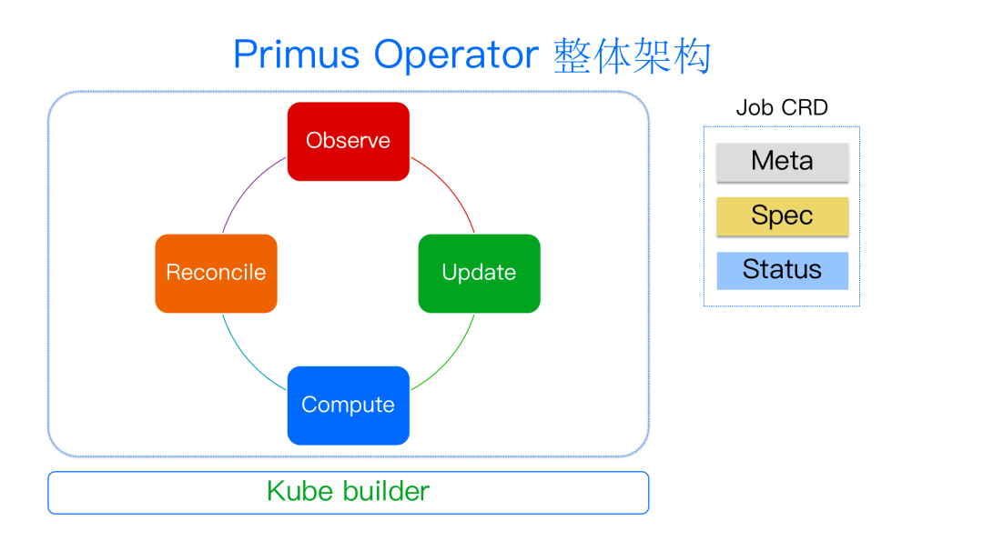 Primus Operator 总体基于开源 Cookie Builder 架构,拥有四个流转状态:首先观察整个 Job 的状态,然后将状态 Update 到 Job CRD 的 Status 内,再去查看用户/作业需求方的作业拓扑期望,计算需要申请的 POD 资源,最后在 Reconcile 时实现第二步 Update 结果和第三步 Compute 期望值之间的协调,从而完成整个状态的流转。