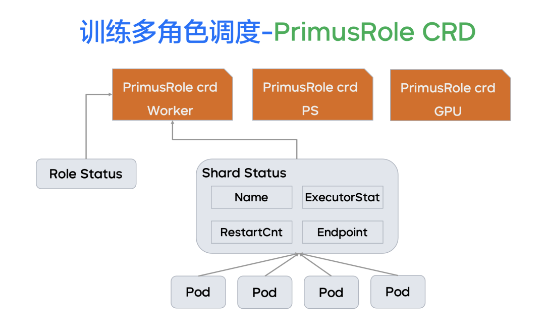 每个 Job CRD 都有 Spec 和 Status 两个部分,为了实现多角色调度,我们进一步打造了 CRD 家族。除了上文提到的 Job CRD,每个 Job 会关联若干个 PrimusRole CRD。同时针对数据部分,我们抽象了 PrimusData CRD。在 PrimusRole CRD 中,每一个角色都对应一个 Role 的 CRD。所有 Primus Job 的拓扑最终被协调出来的结果,就是在 Kubernetes 或者 YARN 中的一个作业框架(如上图下方)。