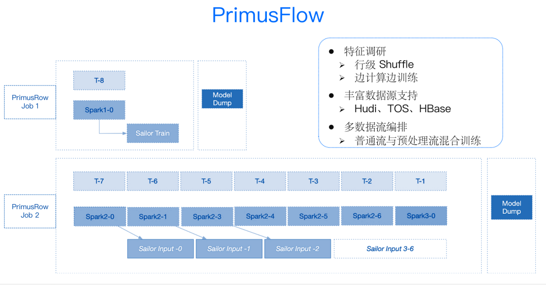 为此,我们引入了伴生数据预处理的模型训练机制——PrimusFlow。一方面,它可以支持丰富的数据源,任何一个被 Spark 预处理的数据源,都可以被 PrimusFlow 机制处理,我们通过 Spark 读取,Load 中间状态进行训练。另外,PrimusFlow 支持更丰富的调研模式,支持行级 Shuffle,我们可以进行数据预处理,按行或按某个用户 ID 进行加工处理,以此来提升模型训练效果。