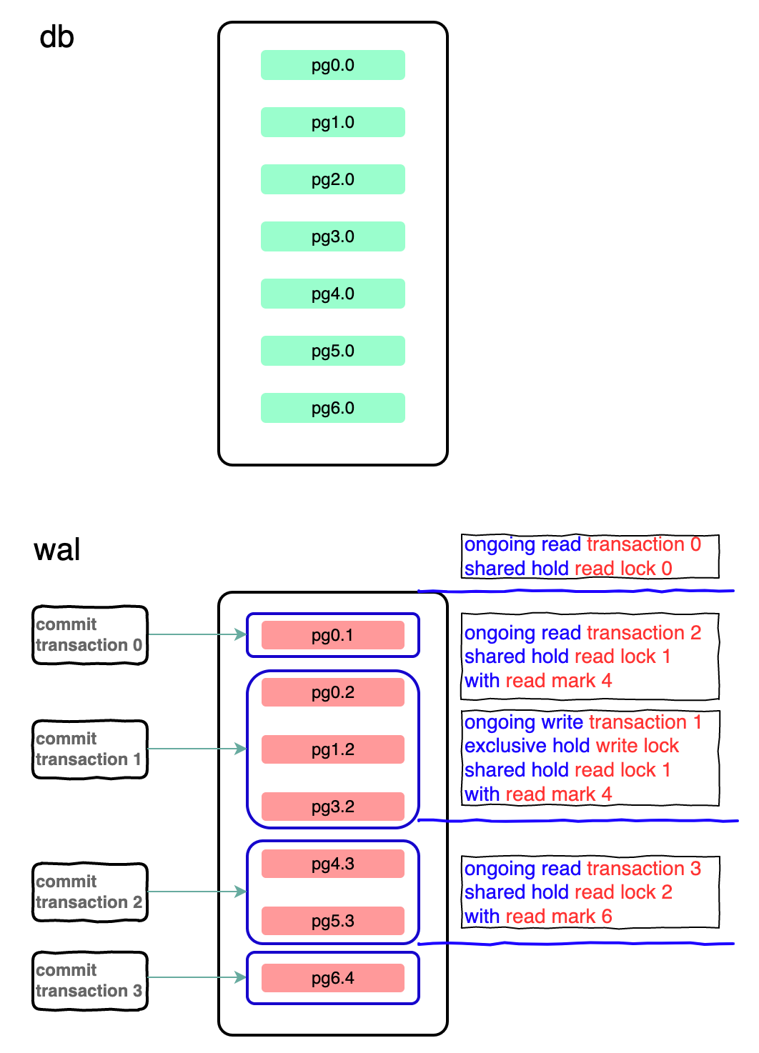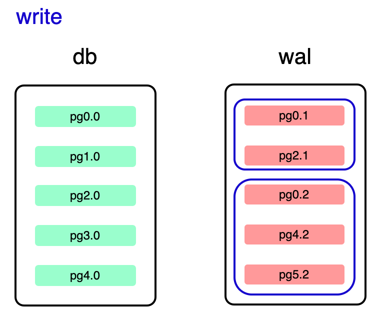 pgx.y,x 表示当前 page 的 num,y 表示当前 page 的版本,每个提交的事务都保存当前修改后的 page 副本; 图中 wal 中提交了两个事务,wal 中蓝色框表示一个完整事务修改的所有 page; wal 实际中保存的单位是 wal frame,除了修改的页面还会保存 page number checksum 等信息,这里为了突出展示了 page, 详细格式见:https://www.sqlite.org/fileformat2.html