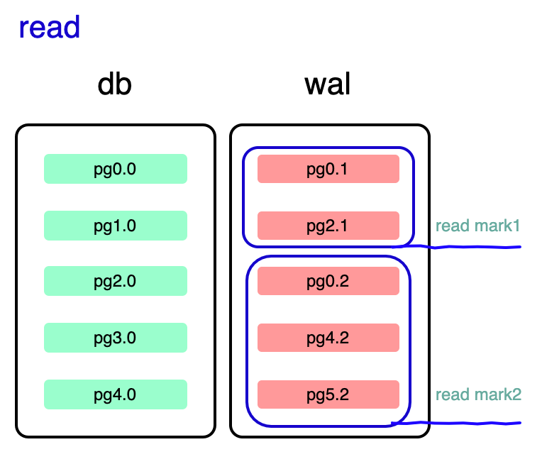 读与写可以并发; 每个读事务会记录 wal 文件中一个 record 点,作为它的 read mark,每个事务执行过程中 read mark 不会发生改变,新提交的事务产生的修改不会影响旧的事务。read mark 会选择事务完整提交后的位置。原始 db 文件和 wal 中 read mark 之前的记录构成了数据库的一个固定的版本记录; 读事务读一个 page 优先读 wal 文件,没有则读原始文件; 如果一个 page 在 wal 中有多个副本,读 read mark 前的最后一个; 同一个 read mark 可以被多个读事务使用。