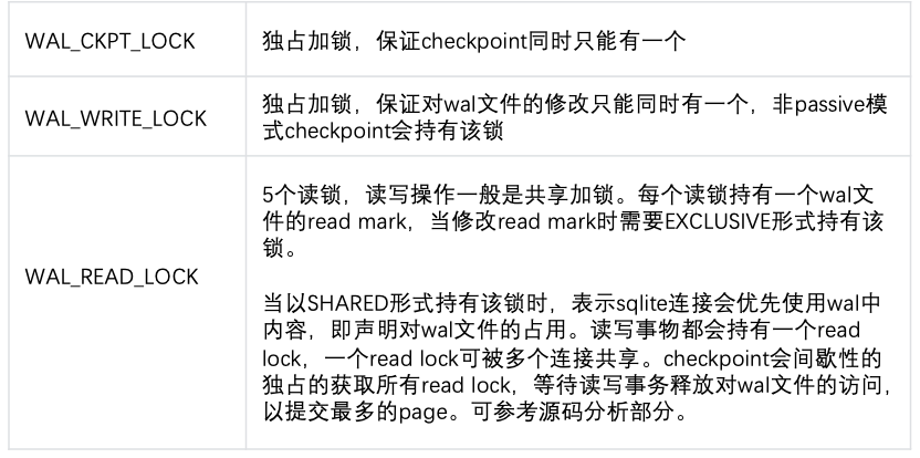 wal 并发实现上主要通过文件锁,和文件级别 mvcc 来实现文件级别的读写并发。 锁即下文源码中的 WAL_CKPT_LOCK,WAL_WRITE_LOCK 和WAL_READ_LOCK,出于简化问题考虑省略了 WAL_RECOVER_LOCK 等相关性不大的其他锁的讨论。mvcc 即通过文件多副本和 read mark 实现,后文也会详细介绍。
