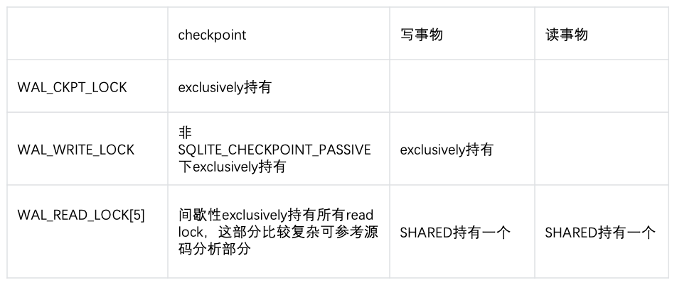 读和读可以同时进行; 读和写可以同时进行; checkpoint 和读事务也存在很大程度的并发,checkpoint 对读锁持有都是间歇性的,理论上都是耗时很短。仔细观察上面的源码分析部分,虽然会周期性持有读锁,基本上是等待读事务释放读锁,在真正耗时的 io 操作回写 wal 日志到 db 的过程中,还是可以发起读事务的。这种实现 checkpoint 对读存在着某种避让,读操作过于激进,会导致 checkpoint 饥饿,极端点会导致 wal 文件异常大; passive checkpoint 和写事务,理论上也是可以并发; 非passive checkpoint 和写事务,理论上不可以并发。