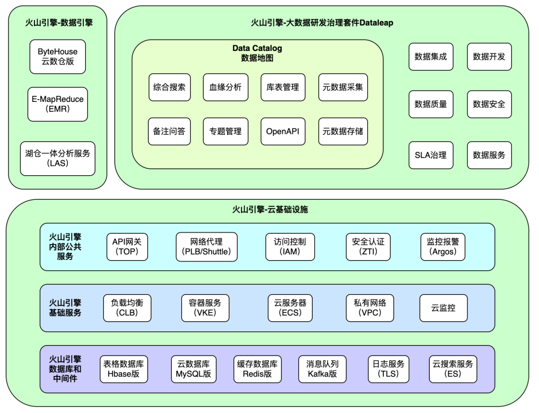Data Catalog 支持综合搜索、血缘分析、库表管理、元数据采集、备注问答、专题管理、OpenAPI 等功能,和 DataLeap 其他功能模块(如数据开发、数据集成、数据质量、数据安全等)一起提供了大数据研发和治理场景的一站式解决方案。同时,Data Catalog 公有云产品是基于火山引擎提供的数据引擎和云基础设施来部署和服务的,下面会简单介绍下我们所依赖和使用的产品和服务: