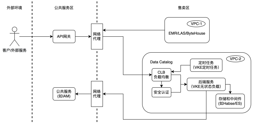 Data Catalog 会依赖一些内部公共服务,这类服务通常都部署在公共服务区,而按照网络和数据安全规范,Data Catalog 作为独立云产品需要部署在售卖区独立 VPC 内,类似的情况 Data Catalog 依赖的数据中台产品也需部署在独立 VPC 内,例如 EMR、LAS 和 Bytehouse。另外,Data Catalog 对外会提供 OpenAPI,外部客户可以通过火山引擎的 API 网关来访问这些 API,但 API 网关服务是在公共服务区,无法直接访问到 Data Catalog 服务,基于以上情况,为了正常对外提供服务,我们需要解决网络隔离问题同时还要保证安全性。