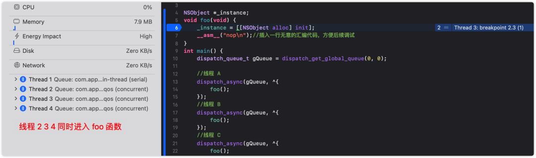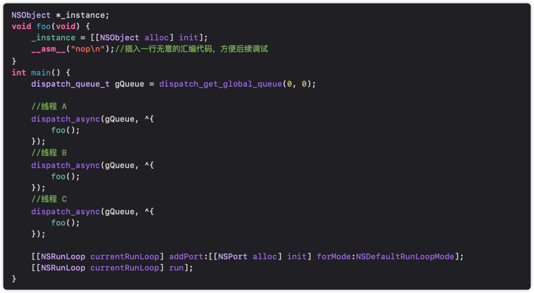 为了演示仅一行赋值代码就能造成崩溃,以及清晰地分析崩溃的原因,我设计了一个 Demo,在 B 线程中释放 A 线程创建的对象使 C 线程崩溃: