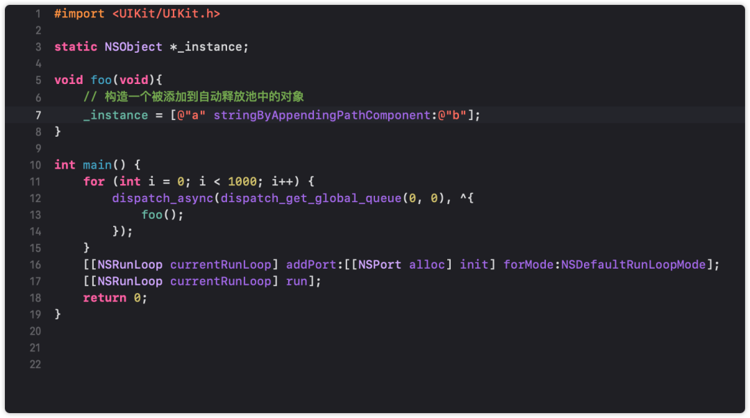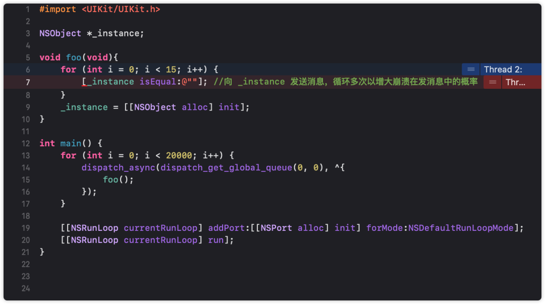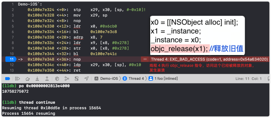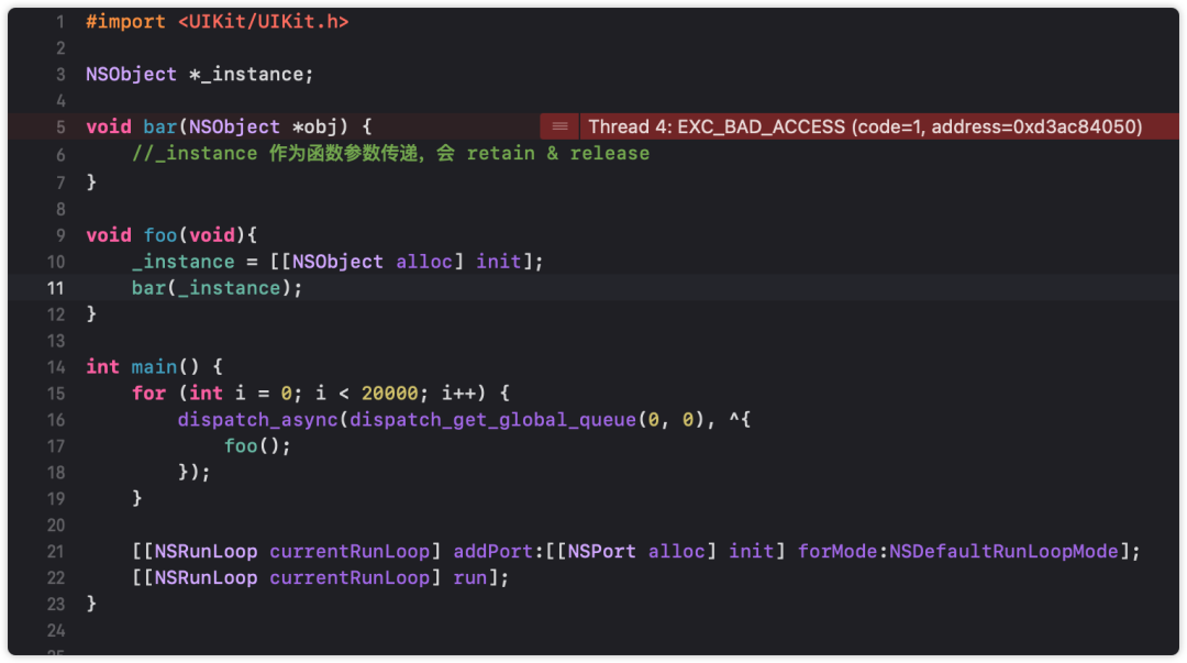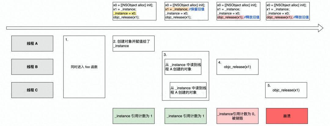 开头的接口创建,并且不满足 Autorelease elision [3] 策略,会被添加到自动释放池中。本例创建的 _instance 被添加到子线程的自动释放池中,子线程任务执行完成后会对池中的对象 pop,依次调用 objc_release 进行释放,若次此时 _instance 已在其它线程中销毁,就会发生崩溃。