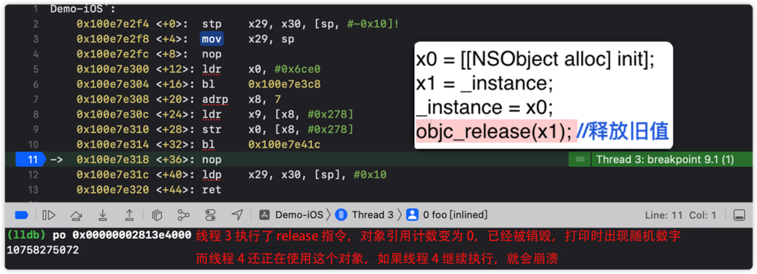 objc_release 会减小对象的引用计数,减小到 0 时对象就会被销毁,假如这时有其它线程正在使用这个对象,那么使用对象的线程就很可能发生崩溃。