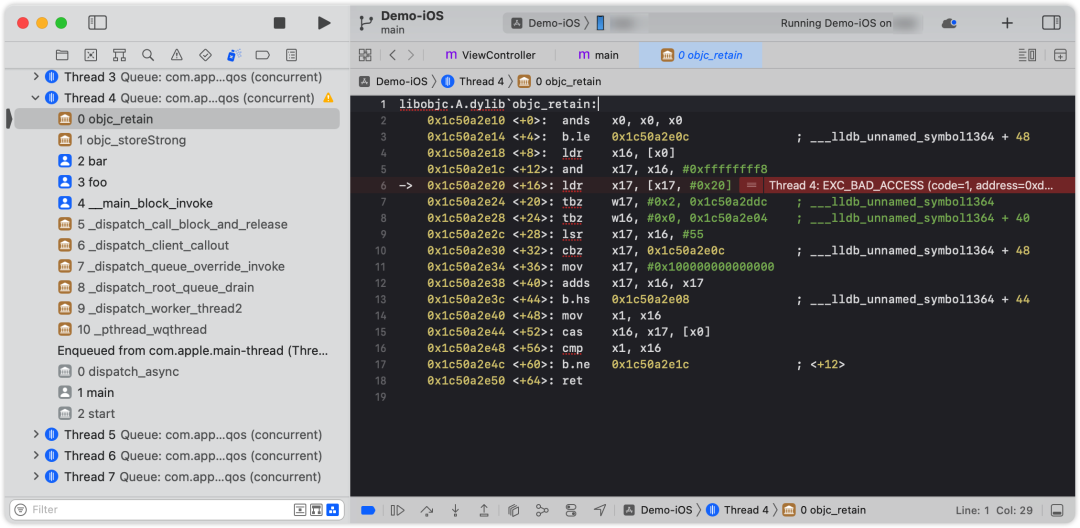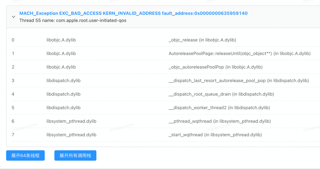 有业务代码堆栈的崩溃,可以通过反汇编推断出具体崩溃的对象;在工程中检索对该对象赋值的代码是否存在多线程调用,如果存在就基本可以确认崩溃原因是多线程赋值导致。 纯系统堆栈的崩溃,如发生在 objc_autoreleasePoolPop 堆栈的崩溃。通过反汇编只能推断出是某个对象被 over-release 了,无法推断出具体是哪个对象。字节内部的同学可以使用 APM 提供的 Zombie、GWPASan、Coredump 等线上工具 [5]进行排查;如果没有线上工具,需要找到与该崩溃同一版本/时间段上涨的其它野指针崩溃,它们有可能是同一个原因导致的,从有业务代码堆栈的崩溃入手去排查。