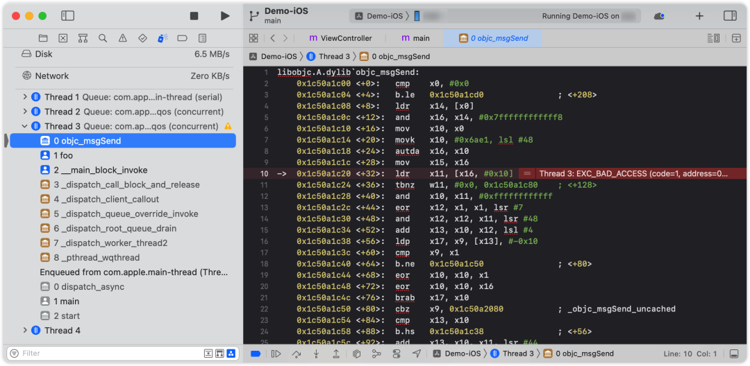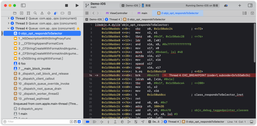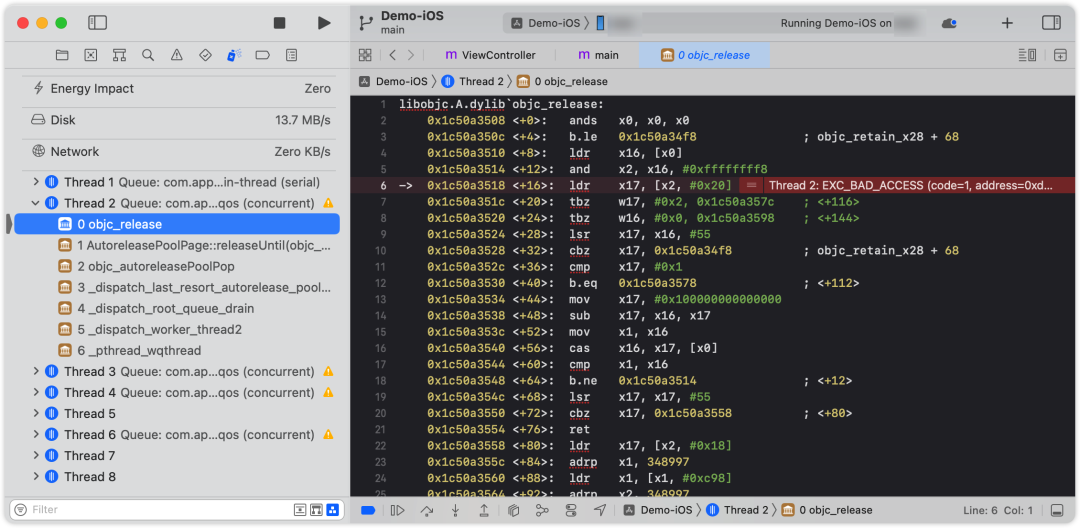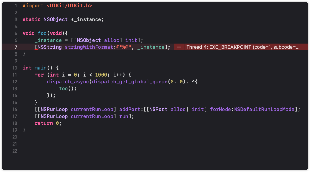 除了上面提到的 EXC_BAD_ACCESS 异常,这类问题也能导致其它类型的异常,这里举一个 EXC_BREAKPOINT 异常的例子。