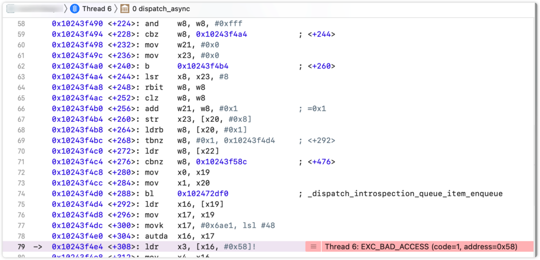 崩溃在 ldr x3, [x16, #0x58] 是因为 x16 存储的是 dispatch_async 的参数 queue,queue 被销毁后,queue + 0x58 可能是一个非法内存地址,从该非法地址读值会导致异常。