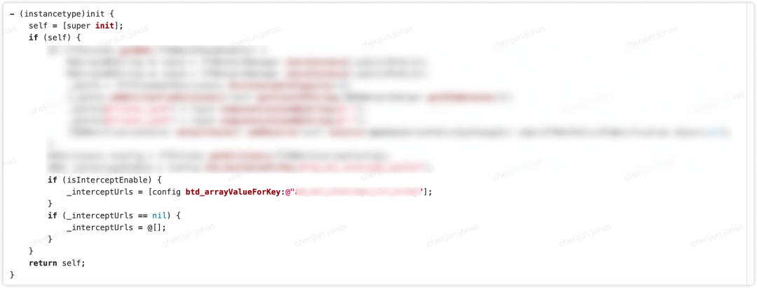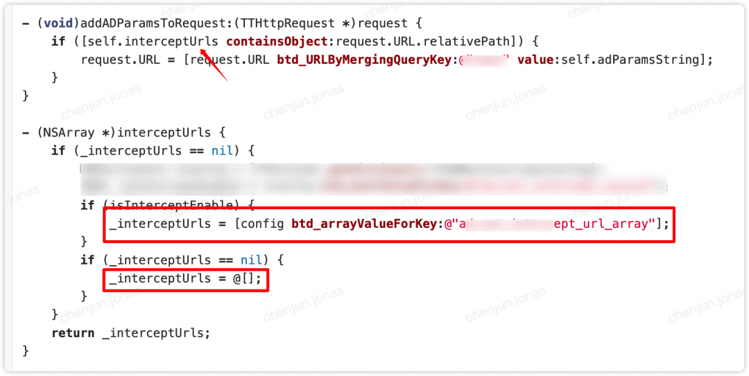 某类在懒加载方法中对 _interceptUrls 赋值,在 addADparamsToRequest 方法中调用 self.interceptUrls