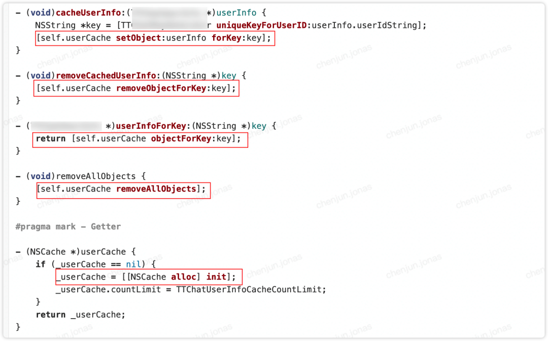 某类在懒加载方法中对 _userCache 赋值,在 cacheUserInfo: