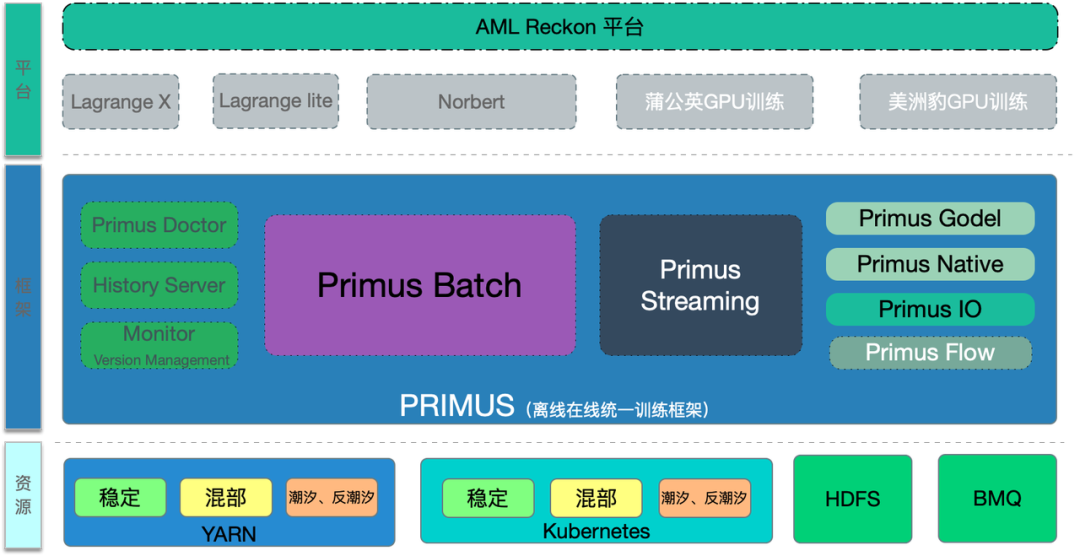 整个机器学习生态从上到下分为“平台层”“框架层”“资源层” 3 个部分。字节跳动算法工程师使用 Reckon 训练平台完成了模型编写、训练、上线的全部过程。Reckon 训练平台中包含基于 TF 深度优化定制的 4 大深度学习框架——Lagrange 框架、Lagrange-Lite、蒲公英、美洲豹,这 4 个框架均通过 Primus 框架进行托管。