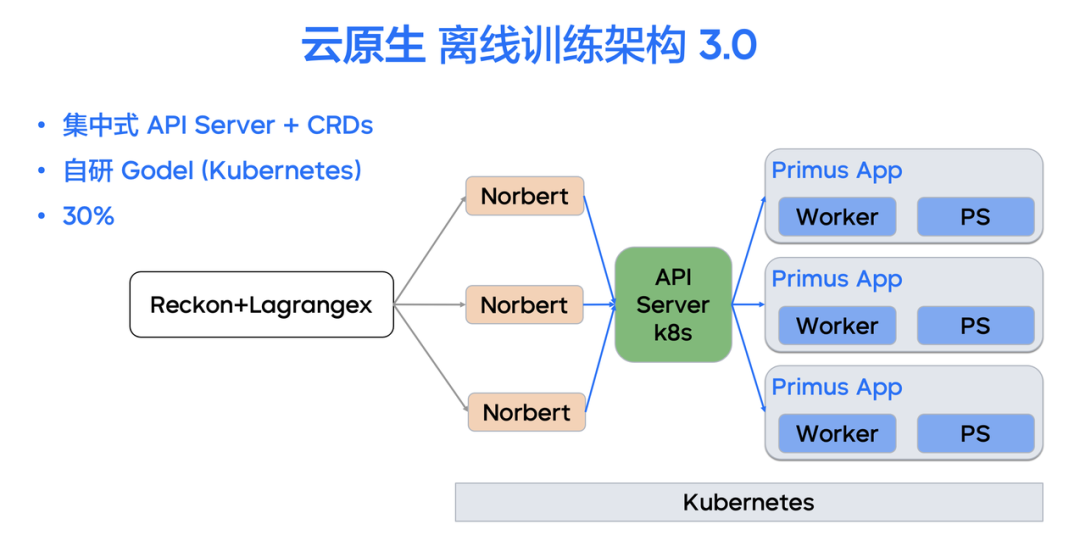 当内部大量资源从 YARN 迁移到 Kubernetes 后,系统不再为每个作业都产生一个 API Server 而是复用 Kubernetes 集群的全局 API Server,由 Norbert Driver 向全局 API Server 发布训练需求声明。