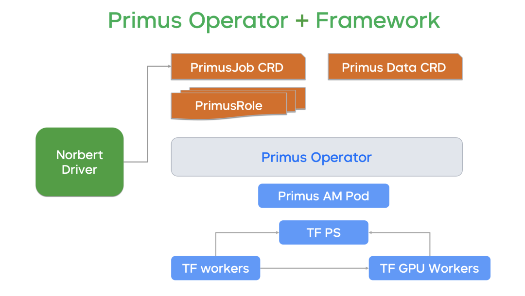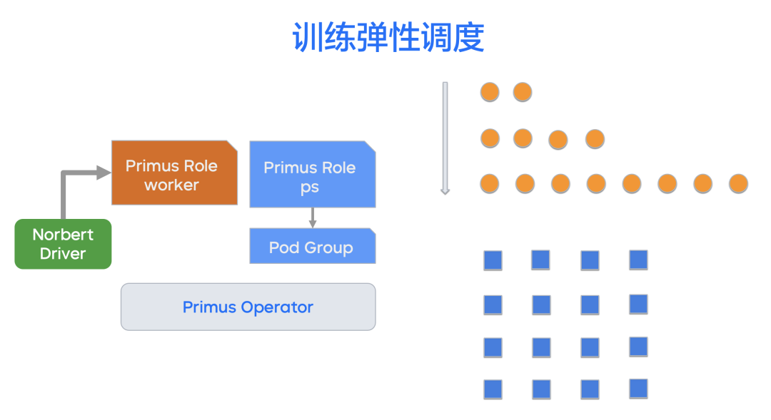 伴生式训练管理 Norbert Driver:将每个核心调度中枢的作业都配备对应的调度大脑,通过声明式的 API Server 控制每个调度的拓扑——Worker 角色和 PS 角色。 声明式 API Server:在每个离线训练 Job 中,都内建了一个独占式的 API Server。Norbert 训练管理 Driver 大脑通过声明式 API Service,发布控制训练拓扑、动态添加数据源、动态创建角色等训练需求;Primus 框架 Watch 并响应声明,完成重新申请容器、重新规划角色、重新构建 Task 等具体工作。 伴生式 Parameter Server:声明式 API Server 创建的伴生 PS 角色,实现每套训练作业专属自己的 Prameter Server,能够支持 PS Shard Failover、自动 PS 分片 ReHash、PS 资源弹性扩缩容等能力,彻底解决了服务化 PS 和训练 Worker 的资源匹配难题。
