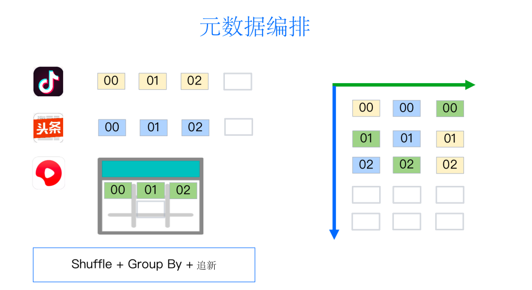 字节跳动的算法工程师依托云原生离线训练的数据编排能力,对抖音、头条和西瓜业务的三个数据源进行了建模训练,每个数据源分别按 00 小时、01 小时、02 小时进行存储,同时在头条和西瓜中每个小时都进行一次聚合,最终达到在 00 小时分别消费了头条、西瓜和抖音的一个数据,而在第 01 小时通过多个数据源的重新排列,避免了模型编排的趋向性,在第 02 小时进一步进行数据源打散。