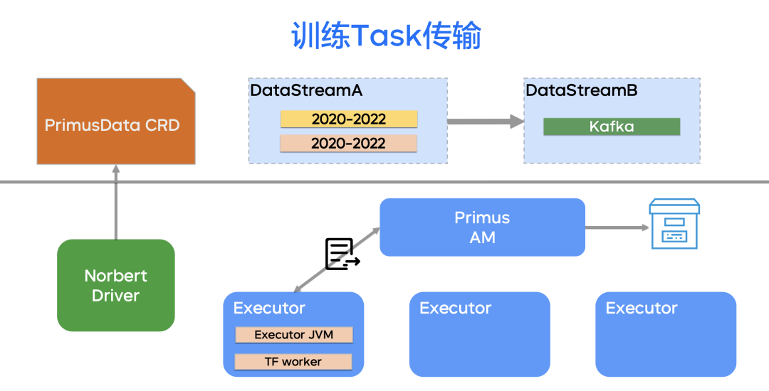 DataStream 里的若干个 DataSource 被按天、按小时聚合之后,会通过 Primus AM 实现文件的切分,切分的力度是按天、按小时聚合之后的原始 HDFS 路径或者 Feature Store 目录。切分的结果是若干个 Split 通过心跳的方式下发 Task 到 Executor。 随着心跳,我们还会每时每刻回发当前训练中 Task 的消费进度,以方便 FellOver 的时候,我们能够从断点当中继续消费来进行训练。同时,训练的进度被 Primus AM 记录到 HDFS 中,并且持久化,以方便整个 Application 挂掉之后,我们可以从 HDFS 的训练状态当中得到恢复。