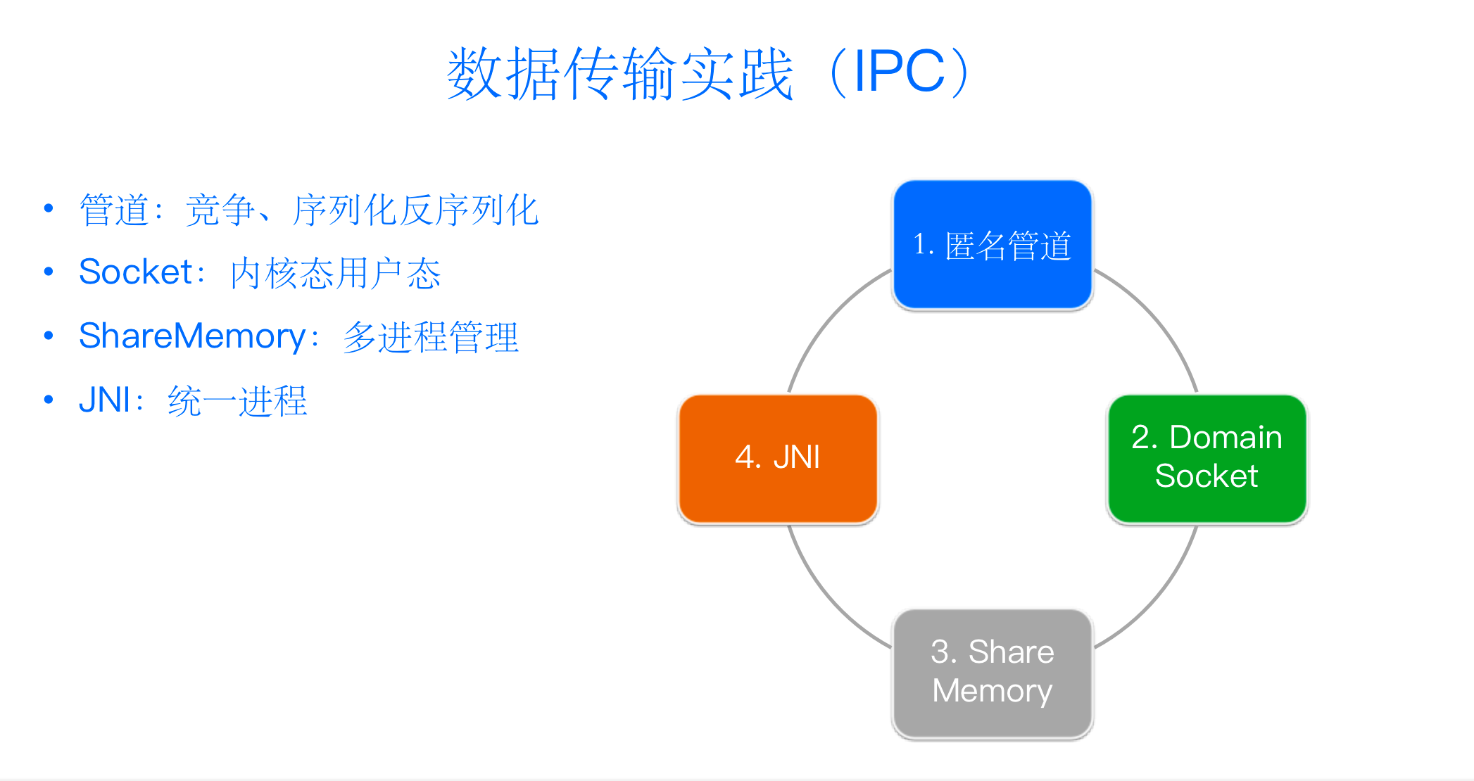 高级数据传输方式:如 Domain Socket,我们采用 Producer 和 Worker 通过两个 TCP Socket 传输的方式,避免了多个 Producer 的管道竞争,但这样依然会存在内核带的拷贝以及序列化和反序列化的开销。随后,我们引入了跨进程之间 Share Memory 机制,做到了多进程管理。最后我们采用 JNI 统一进程机制合并两个进程,实现了样本读取、加工、传输全流程 Lib 化,彻底解决了跨进程之间的 IPC 开销。