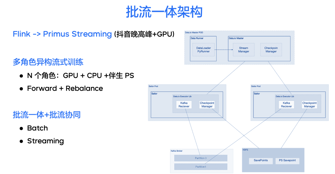 在实践过程中,我们发现批式处理框架也有流式消费的能力。目前的模型建模,一方面是烧脑建模,另一方面是烧卡建模。离线训练在不断地烧卡,同时流式训练过程中也需要烧卡,这主要是因为现有的 Flink 流式训练消费已经无法满足晚高峰时抖音推荐里复杂模型需要的训练能力,因此就需要增加算力,引入 GPU 资源。但 Flink 并不支持异构角色的 Task Manager,而 Primus 天然就是一个异构多角色的训练框架。