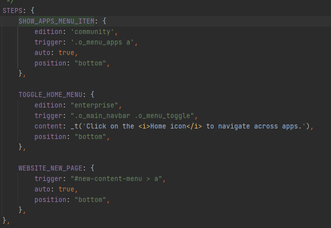 是确保导览在正确页面中的选项,例如,'trigger':'.o_form_editable' 可以在此类的其他页面中看到。