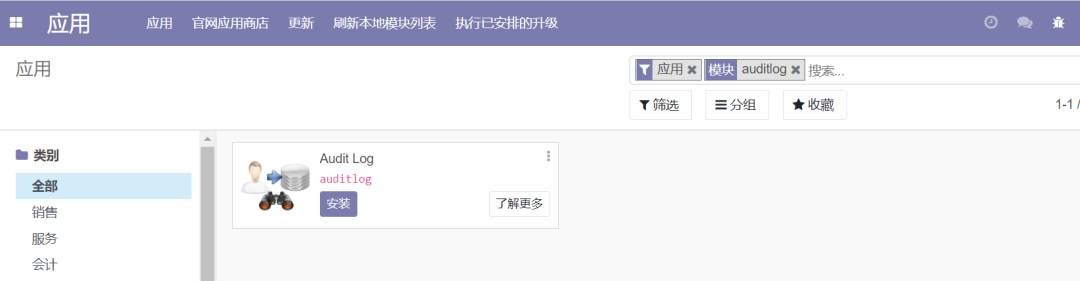在应用中搜索并安装Audit Log模块,如果搜索该模块无结果,则尝试点击刷新本地模块列表。