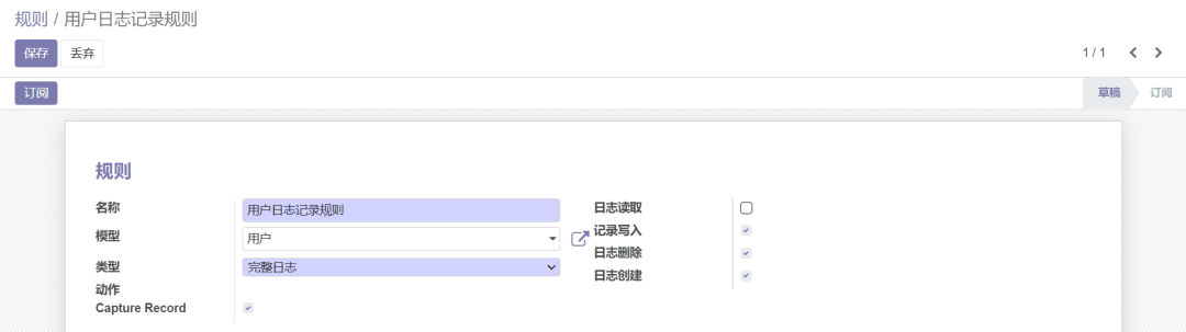 在【审计-规则】中创建一条记录规则以生成用户操作日志。