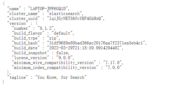 先下载windows版的elasticsearch、filebeat、kibana。将es解压后,直接点击bin目录下的elasticsearch.bat文件即可启动,启动后访问9200端口出现如下信息代表启动成功。