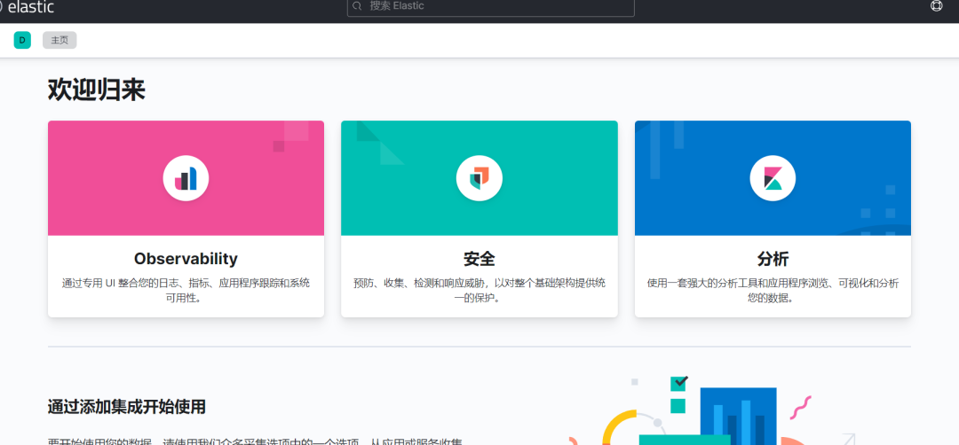 启动kibana,点击bin目录下的kibana.bat即可。访问5601端口进入如下主页代表访问成功。