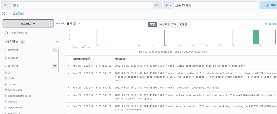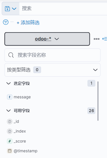 选择刚才创建的数据视图odoo-*,同时选定message字段作为筛选,如图所示:
