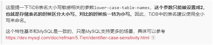 在TiDB中给Schema对象命名的时候养成好习惯,统一使用小写,避免引起不必要的麻烦。