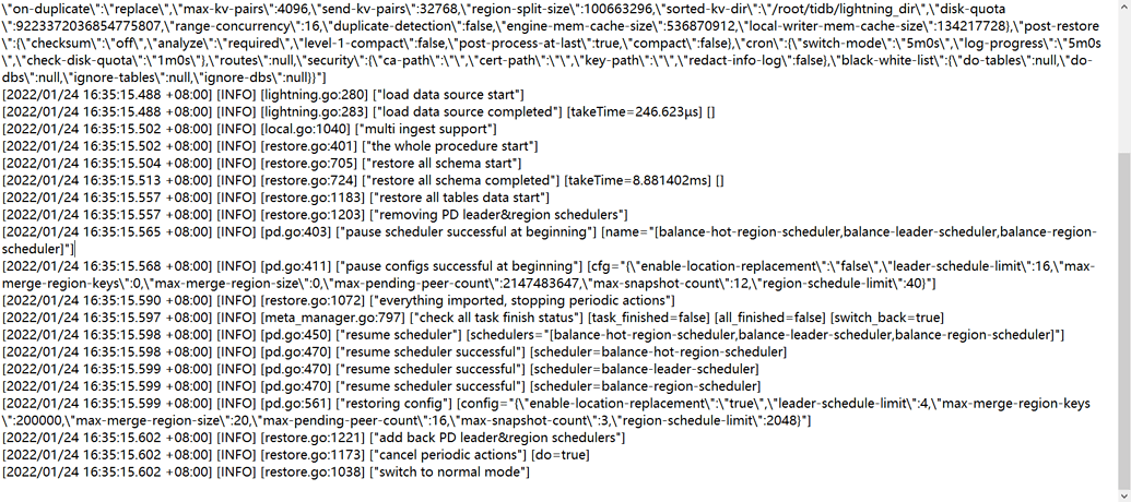 日志里面全部是Info,除了没有正常输出tidb lightning exit以外,看不到任何报错,一幅岁月静好的样子: