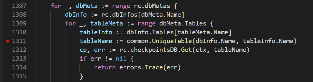 我根据报错的堆栈信息倒推整个Lightning的导入流程,首先定位到restore.go文件第1311行,我看到如下代码: