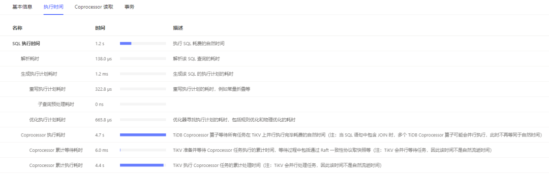 以下是从Dashboard中抓出来的原始SQL和执行计划,总共消耗了1.2s。其中绝大部分时间都花在了Coprocessor扫描数据中: