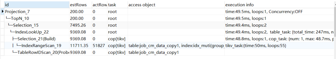 ```sqlid task estRows operator info actRows execution info memory diskProjection_7 root 200 test_ba.job_cm_data.id, test_ba.job_cm_data.common_job_type, test_ba.job_cm_data.org_code, test_ba.job_cm_data.key_one, test_ba.job_cm_data.key_two, test_ba.job_cm_data.key_three, test_ba.job_cm_data.key_four, test_ba.job_cm_data.key_five, test_ba.job_cm_data.key_six, test_ba.job_cm_data.key_seven, test_ba.job_cm_data.key_eight, test_ba.job_cm_data.permission_one, test_ba.job_cm_data.permission_two, test_ba.job_cm_data.permission_three, test_ba.job_cm_data.cur_thread, test_ba.job_cm_data.group_id, test_ba.job_cm_data.max_execute_count, test_ba.job_cm_data.remain_execute_count, test_ba.job_cm_data.total_execute_count, test_ba.job_cm_data.pre_excutetime, test_ba.job_cm_data.related_data, test_ba.job_cm_data.delay_time, test_ba.job_cm_data.error_message, test_ba.job_cm_data.flag, test_ba.job_cm_data.ynflag, test_ba.job_cm_data.create_time, test_ba.job_cm_data.update_time, test_ba.job_cm_data.create_user, test_ba.job_cm_data.update_user, test_ba.job_cm_data.ip, test_ba.job_cm_data.version_num 0 time:1.17s, loops:1, Concurrency:OFF 83.8 KB N/A└─Limit_14 root 200 offset:0, count:200 0 time:1.17s, loops:1 N/A N/A└─Selection_31 root 200 eq(test_ba.job_cm_data.ynflag, 1) 0 time:1.17s, loops:1 16.3 KB N/A└─IndexLookUp_41 root 200 0 time:1.17s, loops:1, index_task: {total_time: 864.6ms, fetch_handle: 26.1ms, build: 53.3ms, wait: 785.2ms}, table_task: {total_time: 4.88s, num: 17, concurrency: 5} 4.06 MB N/A├─IndexRangeScan_38 cop[tikv] 7577.15 table:job_cm_data, index:idx_group_id(group_id), range:["GROUP_MATERIAL","GROUP_MATERIAL"], keep order:true 258733 time:3.34ms, loops:255, cop_task: {num: 1, max: 2.45ms, proc_keys: 0, rpc_num: 1, rpc_time: 2.43ms, copr_cache_hit_ratio: 1.00}, tikv_task:{time:146ms, loops:257} N/A N/A└─Selection_40 cop[tikv] 200 eq(test_ba.job_cm_data.cur_thread, 1), eq(test_ba.job_cm_data.flag, 0), lt(test_ba.job_cm_data.pre_excutetime, 2022-04-27 11:55:00.018000) 0 time:4.68s, loops:17, cop_task: {num: 18, max: 411.4ms, min: 15.1ms, avg: 263ms, p95: 411.4ms, max_proc_keys: 20480, p95_proc_keys: 20480, tot_proc: 4.41s, tot_wait: 6ms, rpc_num: 18, rpc_time: 4.73s, copr_cache_hit_ratio: 0.00}, tikv_task:{proc max:382ms, min:12ms, p80:376ms, p95:382ms, iters:341, tasks:18}, scan_detail: {total_process_keys: 258733, total_process_keys_size: 100627600, total_keys: 517466, rocksdb: {delete_skipped_count: 0, key_skipped_count: 258733, block: {cache_hit_count: 1296941, read_count: 0, read_byte: 0 Bytes}}} N/A N/A└─TableRowIDScan_39 cop[tikv] 7577.15 table:job_cm_data, keep order:false 258733 tikv_task:{proc max:381ms, min:12ms, p80:375ms, p95:381ms, iters:341, tasks:18} N/A N/A```