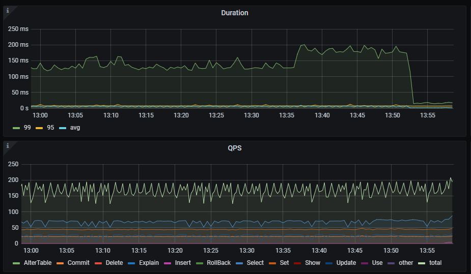 正当我觉得删掉索引就万事大吉的时候,监控里的Duration 99线突然升高到了200多ms。满脸问号赶紧查一下慢日志是什么情况?发现这条SQL执行时间虽然变短了,但是慢SQL突然就变多了: