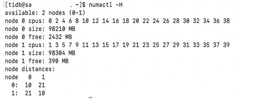 NUMA(Non-Uniform Memory Access) 非均匀内存访问架构是指多处理器系统中,内存的访问时间是依赖于处理器和内存之间的相对位置的。CPU 访问“本地” Memory 时速度更快,CPU 跨节点访问“远程” Memory 时速度较慢。UMA(Uniform Memory Access) 均匀内存访问架构则是与NUMA相反,所以处理器对共享内存的访问距离和时间是相同的。可以使用 numactl -H 查看服务器 NUMA 分布。如下图所示:NUMA node 0 包含 0 2 4 6 8 等序号 CPU,包含 98210 MB “本地”内存;NUMA node 1 包含 1 3 5 7 9 等序号 CPU,包含 98210 MB “本地”内存。最后 node distance 显示 NUMA node 0 访问“本地”内存耗时 10 个单位时间,访问“远程” NUMA node 1 内存耗时 21 个单位时间。