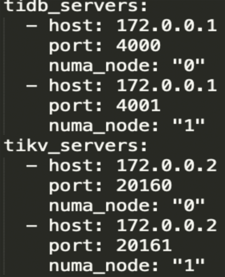 TiDB 支持与 NUMA 结合使用,在 TiUP 配置文件中可以给 TiDB,TiKV 等实例配置对应的 NUMA Node。