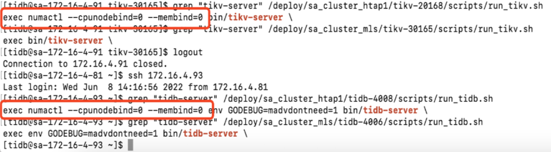 配置 NUMA node 之后使用 TiUP 启动集群,查看启动命令。