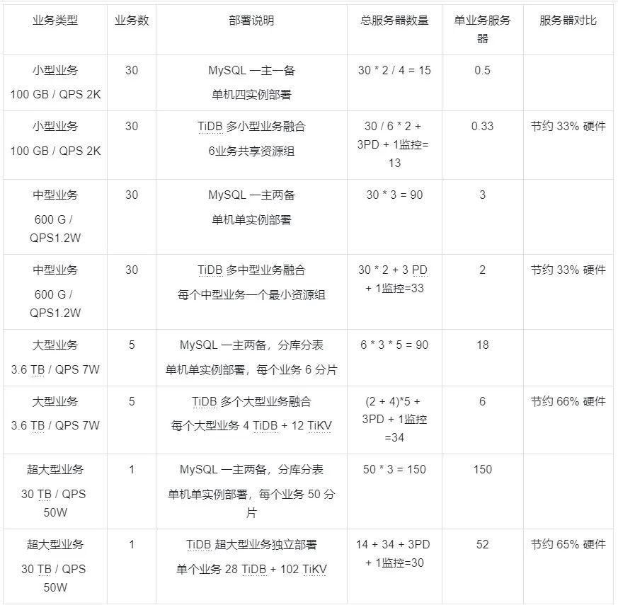 由于 TiDB 各个组件资源需求不一致,在本地化部署 TiDB 集群时,比较难找到正好适配的服务器搭建单服务器单实例,如某个服务器正好 8C/16GB/1 SSD 搭建 PD 服务,导致准备服务器成本提升。使用 NUMA 和 cgroup 能力则可以很好解决机型不适配的问题。使用 NUMA + cgroup 实现 3 台服务器搭建一套生产可用集群,具体如下图所示:三台服务器,每台 64C/128G/2 NUMA Node/ 1+ SSDTiDB * 2 (24C/48G) 占用 Server 1 / 2 NUMA Node 1 节点;TiKV * 3 (24C/64G) 占用 Server 1 / 2 / 3 NUMA Node 0 节点;PD * 3 (8C/16G) 占用 Server 1 / 2 资源,第三个 PD 占用 Server 3 NUMA Node 1 节点;监控部署在 Server 3 NUMA Node 1 节点。实现 3 台常见机型服务器搭建一套生产可用 TiDB 集群,每个实例都满足生产资源要求,并且基于 NUMA + cgroup 实现单机多实例之间资源隔离。对比 TiDB 官网需要 9 台恰好适配的服务器,使用以上 3 台通用服务器部署 TiDB 集群成本更低,采购更简单。降低新用户使用 TiDB 门槛。对比目前一般用户目前 TiDB 集群部署方式,多业务融合一个中型业务只需要一个资源组资源(2 TiDB + 3 TiKV),并且利用单机多实例部署能力,一个资源组只需要 2 台服务器,可以显著节约硬件资源。假设每台服务器资源为 64C/128G/2 TB NVME SSD * 3,每台服务器部署 2 个 TiDB 实例或者 3 个 TiKV 实例,对比 MySQL 部署模式通用可以节约硬件。假设有 30 个小型业务,单个业务数据量 100 GB,峰值 QPS 2 K,小型业务数据数据高可用和稳定性要求偏低。MySQL 架构使用单机四实例部署,每个业务采用一主一备方式。则每个业务需要占用 2 / 4 = 0.5 台服务器资源、30个业务一共需要使用 15 台服务器。同样业务使用多业务融合方式部署, 6 个小型业务占用一个独立资源组,此时每个资源组总存储为 600 GB,总 QPS 1.2 W,在独立资源组能力边界内。此时一个业务占用六分之一个资源组即每个业务需要使用 2/6=0.33 台服务器。对比 MySQL 节约 33% 硬件资源。假设有 30 个中型业务,每个业务数据量 600 GB,峰值 QPS 1.2 W,由于中型业务数据量较大,稳定性和数据高可用性要求高,MySQL 架构使用单机单实例部署,每个业务采用一主两备模式保证数据 3 副本高可用。此时每个业务需要 3 台服务器,30 个中型业务一共需要使用 90 台服务器。同样业务使用多业务融合方式部署,每个业务独占一个资源组资源(2 TiDB + 3 TiKV),即 2 台服务器,30 个业务一共使用 60 台服务器左右。对比 MySQL 部署模式每个业务少占用一台服务器,节约 33% 硬件资源。由于 MySQL 扩展性问题,中型业务单表数据量超过几千万时 TiDB 具备性能优势。假设有 5 个大型业务,每个业务数据量 3.6 TB,每个业务峰值 QPS 7 W,由于大型业务数据量大,稳定性和数据可用性要求高,MySQL 架构使用单机单实例分库分表方案,每个业务 6 个分片,并且使用一主两备模式保证数据 3 副本高可用,此时每个业务需要需要 18 台服务器,5 个大型业务一共需要 90 台服务器。同样业务使用多业务融合方案部署,每个业务占用一个资源组资源,每个资源组包含 4 TiDB + 12 TiKV 即 2 + 4 = 6 台服务器(参考 官网 性能测试文档,3 TiDB + 3 TiKV 可以支持 40 W 点查QPS),5 个业务一共使用 30 台服务器,对比 MySQL 分库分表方案节约 66% 左右硬件资源。同时 TiDB 具备易运维、在线 DDL、支持跨分片查询等优势。假设有 1 个超大型业务,数据量 30 TB,业务峰值 QPS 50 W,MySQL 架构使用单机单实例分库分表方案,单个业务 50 个分片,并且使用一主两备模式保证数据 3 副本高可用,此时单个业务需要 150 台服务器。对于此类超大型业务不建议使用多业务融合方案部署,推荐使用单独部署 TiDB 集群,参考官网 性能测试数据此时一共需要 28 TiDB + 35 TiKV 即 14 + 12 = 26 台服务器,对比分库分表方案约节约 80% 硬件资源。基于以上小、中、大、超大业务分析,所有情况 TiDB 计算利用率低于 15% ,TiKV 存储利用率低于 35 %,不存在超用情况。具体总结如下:多个业务多集群需要耗费更多 DBA 运维人员支持数据库运维,比如可以统一升级集群、参数配置、数据备份、高可用、监控、报警、安全审计等。使用单集群支持多个业务可以大大减少运维成本。多业务多集群时,存在数据孤岛问题,想要跨业务关联数据或者实时分析时成本很高,使用多业务融合单集群之后可以很简单实现全域实时强一致性数据关联和分析。并保证分析和统一视图业务与业务隔离。也可以更简单实现跨业务分布式事务。某些大促活动时可以增加资源或者调整配置,让重要业务占用更多存储和计算资源保证大促平稳运行,等待大促结束之后再修改配置将资源再次均匀。在没有多业务融合之前 TiDB 分布式部署架构硬件成本偏高,一般用户会选择数据量较大的业务(大于 300 GB,服务稳定性要求高)使用 TiDB ,但是新客户对 TiDB 运维不熟悉,大业务上线 TiDB 存在运维风险和信心不足等问题。使用多业务融合之后用户可以在更多小型业务尝试使用 TiDB ,在小型业务运维过程中提升对 TiDB 数据库运维技能和产品信心,然后再利用 TiDB 弹性扩缩容能力迁入更多中型业务,或者使用独立集群迁入更多大型业务。有节奏的平稳的实现多个中小业务融合使用统一 TiDB 集群。对比传统数据库多业务多集群方案,使用 TiDB 多业务融合方案,提升了用户数据高可用和扩展性,实现了全域数据实时关联分析,避免了多集群数据孤岛问题,同时降低了多集群硬件成本和运维压力。使用多业务融