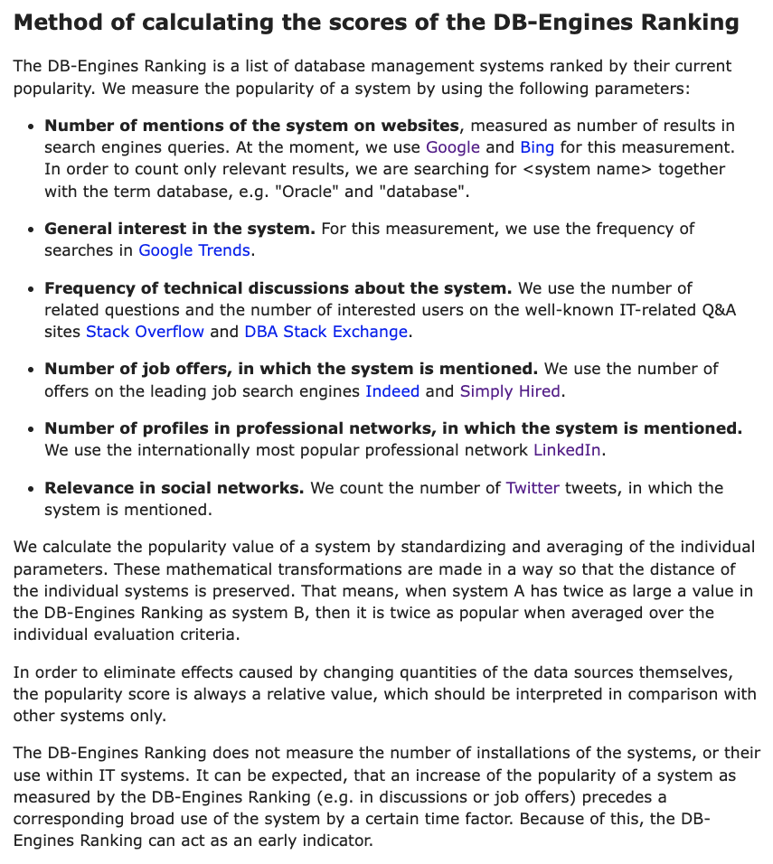 没想到 MongoDB 的降幅是所有数据库里最大的,21 年 MongoDB 还是年度数据库第三。就算大家逐渐从 NoSQL 的热度中清醒了过来,回归到关系型数据库。但整个 NoSQL 行业,2022 相比 2021 并没有里程碑事件发生,让我怀疑这块数据有点问题,所以这次我又去读了一下 DB-Engines 的打分规则。