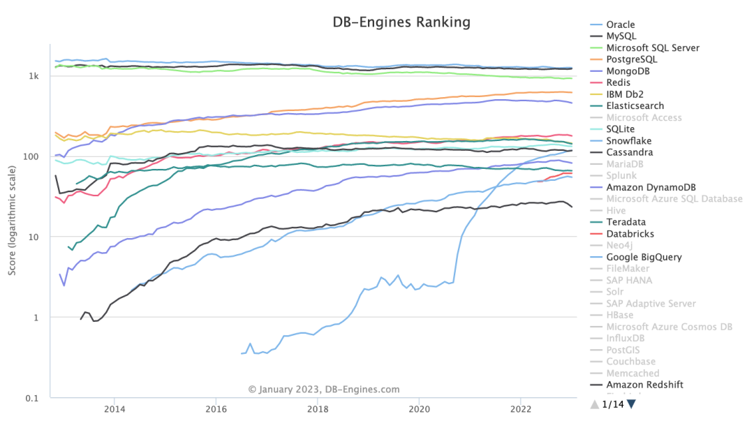 当然 DB-Engines 排名的权威性,业界是认可的,能正确反映整体的趋势。DB-Engines 榜单正好到了第 10 年,我们来看看这 10 年里的优胜者我们再看看 10 年来的趋势图 (log scale 展示)可以清楚地看到老牌数据库都在走下坡路。2022 年 OLTP 这边,三大商业关系型数据库,Oracle, SQL Server, DB2 都在大幅掉分,而 MySQL,PostgreSQL 则都持续稳步增长。而在 OLAP 这边,Snowflake 的异军突起,也是对应着它在商业上的巨大成功;此外 Google BigQuery, Amazon Redshift 同样颇有建树;而老牌的 Teradata 则是走下坡路了。数据库是软件领域的集大成者,如果以单一品类来论,数据库品类也占据着软件业里最大的商业阵地。整个数据库领域历史悠久,上下游玩家众多,50 多年的历史书写了一部交织技术和商业的史诗。如今我们正处在一轮新老交替的周期中点,有些趋势已然清晰:- 老一代商业数据库江河日下,比如 Oracle, DB2, SQL Server, Teradata。