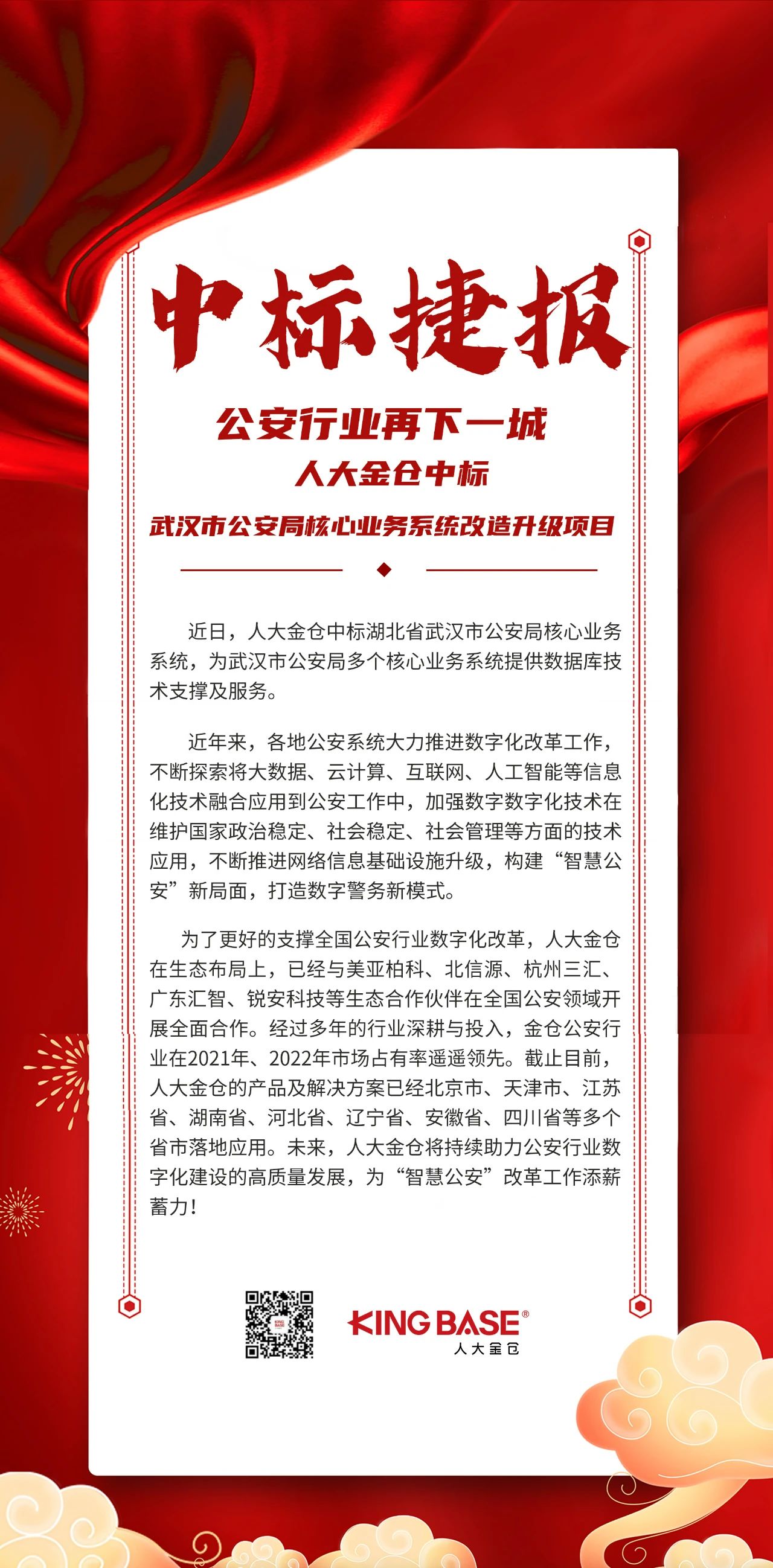 近日,人大金仓中标湖北省武汉市公安局核心业务系统,为武汉市公安局多个核心业务系统提供数据库技术支撑及服务。
