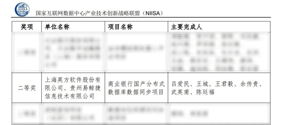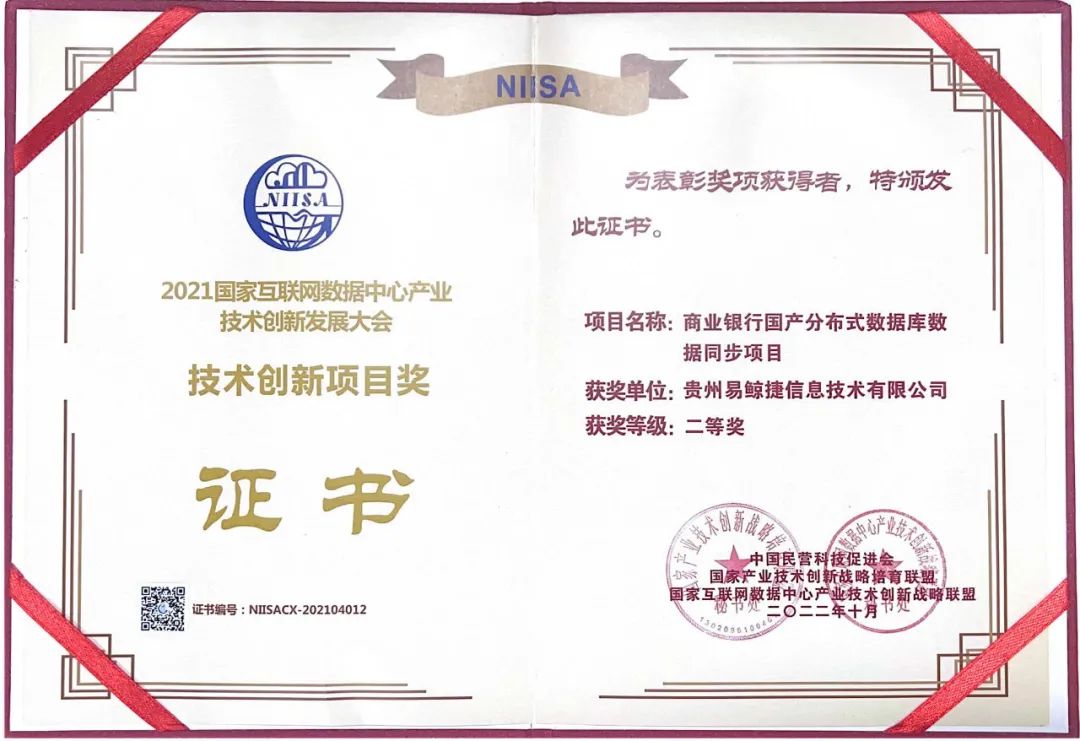 近日,国家互联网数据中心产业技术创新战略联盟(NIISA联盟)对2021年度开展的技术创新项目征集评选工作结果进行了公示。贵州易鲸捷信息技术有限公司(以下简称“易鲸捷”)联合上海英方软件有限公司(以下简称“英方软件”)共同合作的“商业银行国产分布式数据库同步项目” 杀出重围,荣获了2021年度技术创新奖。