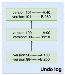 每次数据修改的记录都会被串联起来。另有一个全局变量Global Committed Version(GCV) 标示全局最后提交的版本号。在事务1执行之前GCV是98,事务1提交之后GCV变成100,事务二提交之后GCV变成101。所以,当事务3开始执行时,先获取GCV,然后根据这个版本号去读相应的数据。