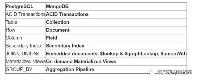 MongoDB的文档模型中使用的许多术语和概念与PostgreSQL的表格模型相同或相似: