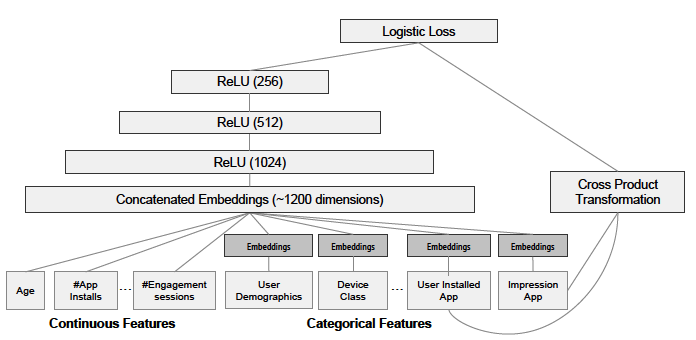 是分位点的个数),数值特征和类别特征拼接起来形成大约1200维的向量再灌入deep模型,而wide模型是APP安装和APP曝光(impression)两类特征通过交叉积变换形成模型需要的特征。最后通过反向传播算法来训练该模型(wide模型采用FTRL优化器,deep模型采用AdaGrad优化器),并上线到APP推荐业务中做AB测试。
