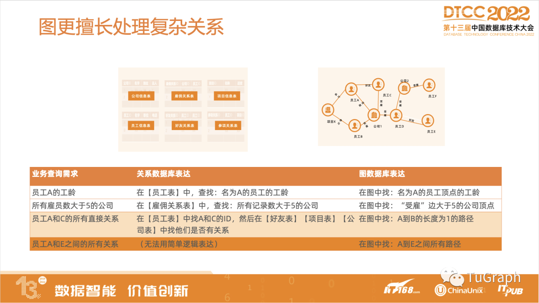 图中表格的前两行属于比较简单的查询,比如某个员工的工龄,直接找到对应的那一行然后取出来就可以;比如找出所有的雇员数大于5的公司,可能在雇佣关系表中就能找出来,在关系数据库里这些都属于常规的操作。